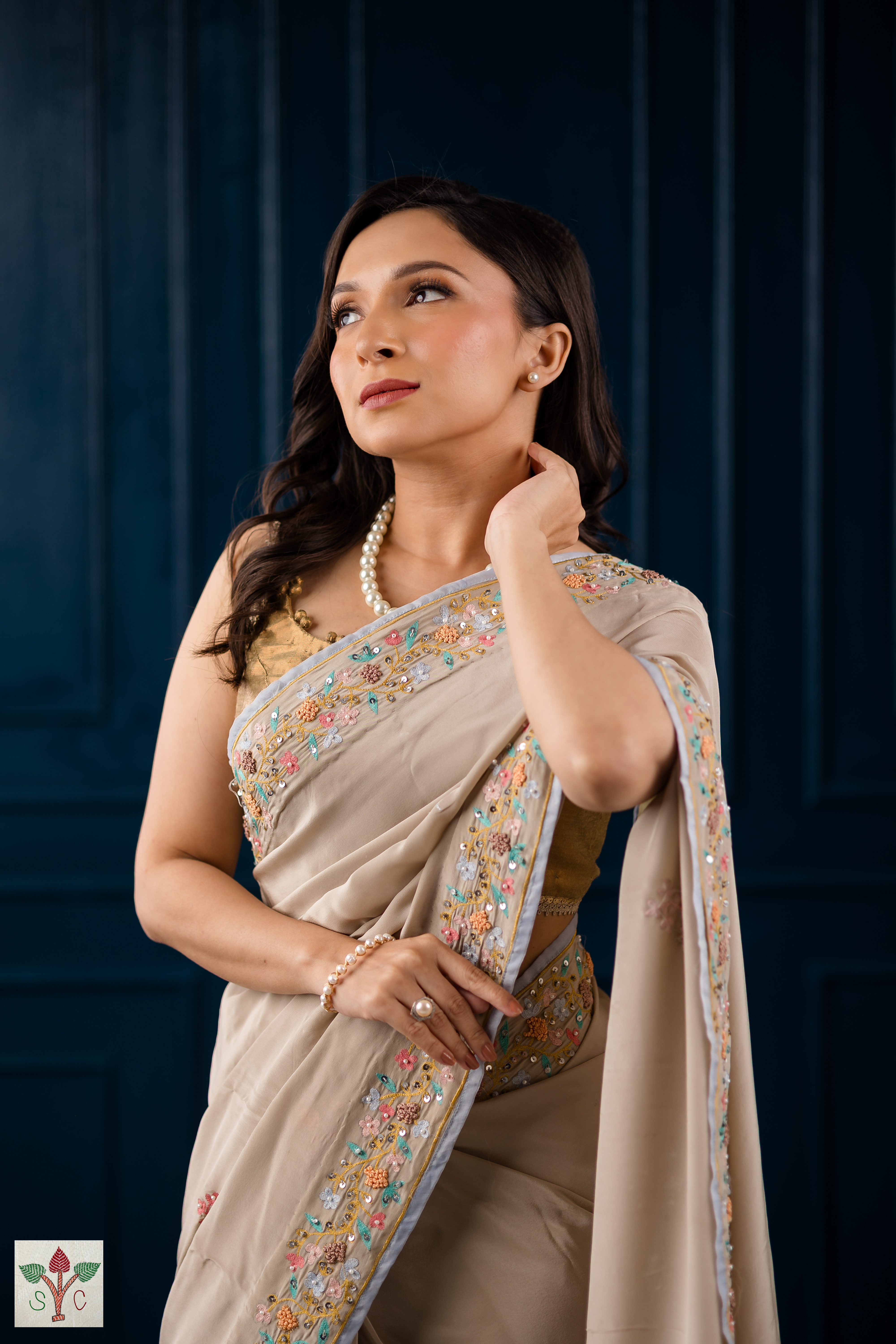 Elevate your wardrobe with the Champagne – crepe silk sari from our Eva Collection designed by Luna. A masterpiece crafted with love, creativity, and tradition. This vibrant sari embodies the rich cultural heritage and meticulous artistry that our online craft store is known for. Sensuality combined with intricate patterns make a striking statement, celebrating craftsmanship and elegance in every weave. Perfect for special occasions, it allows you to embrace tradition while showcasing contemporary style. Discover the timeless beauty and exceptional quality with Champagne today.